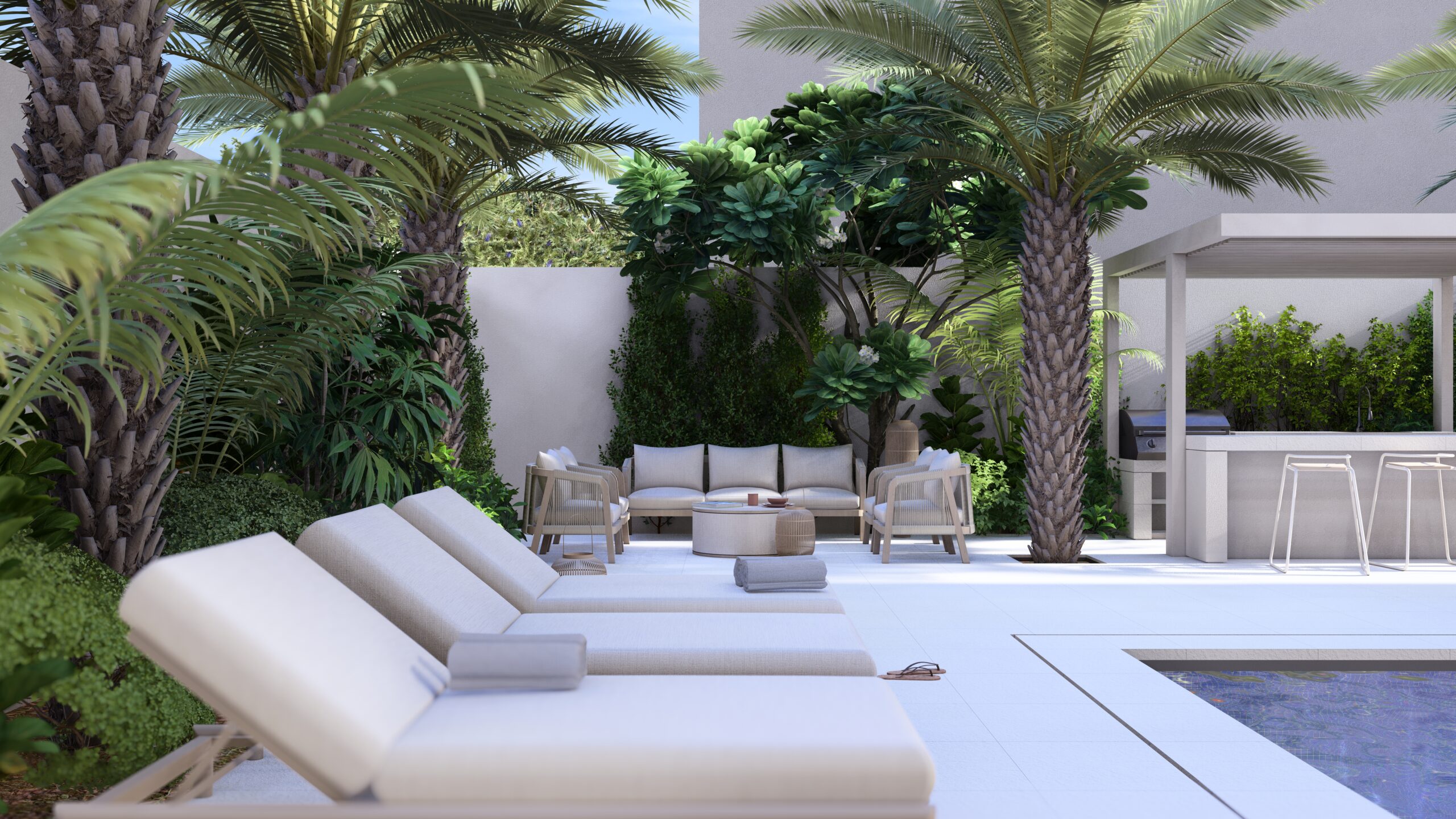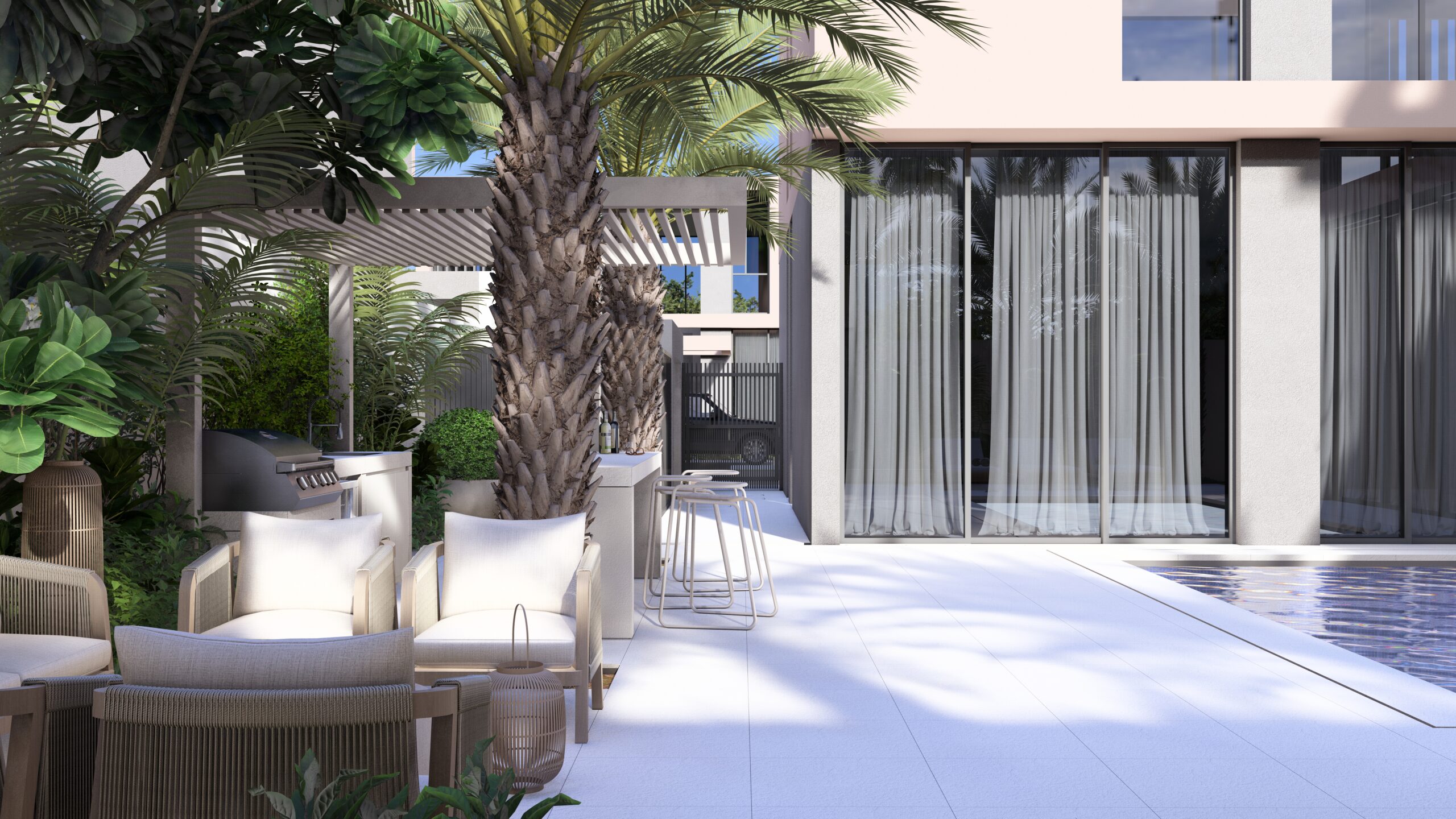 Masaar — This landscape design turns a private villa in Masaar, Sharjah into a calm, Bali-inspired retreat. The space blends tropical warmth with modern simplicity, using neutral tones, natural textures, and plants suited to the local climate. Every element—from the furniture to the finishes—ties seamlessly with the villa’s architecture. Shaded seating areas invite both quiet moments and social gatherings, creating a relaxed, timeless atmosphere that feels like a private tropical escape in the desert.