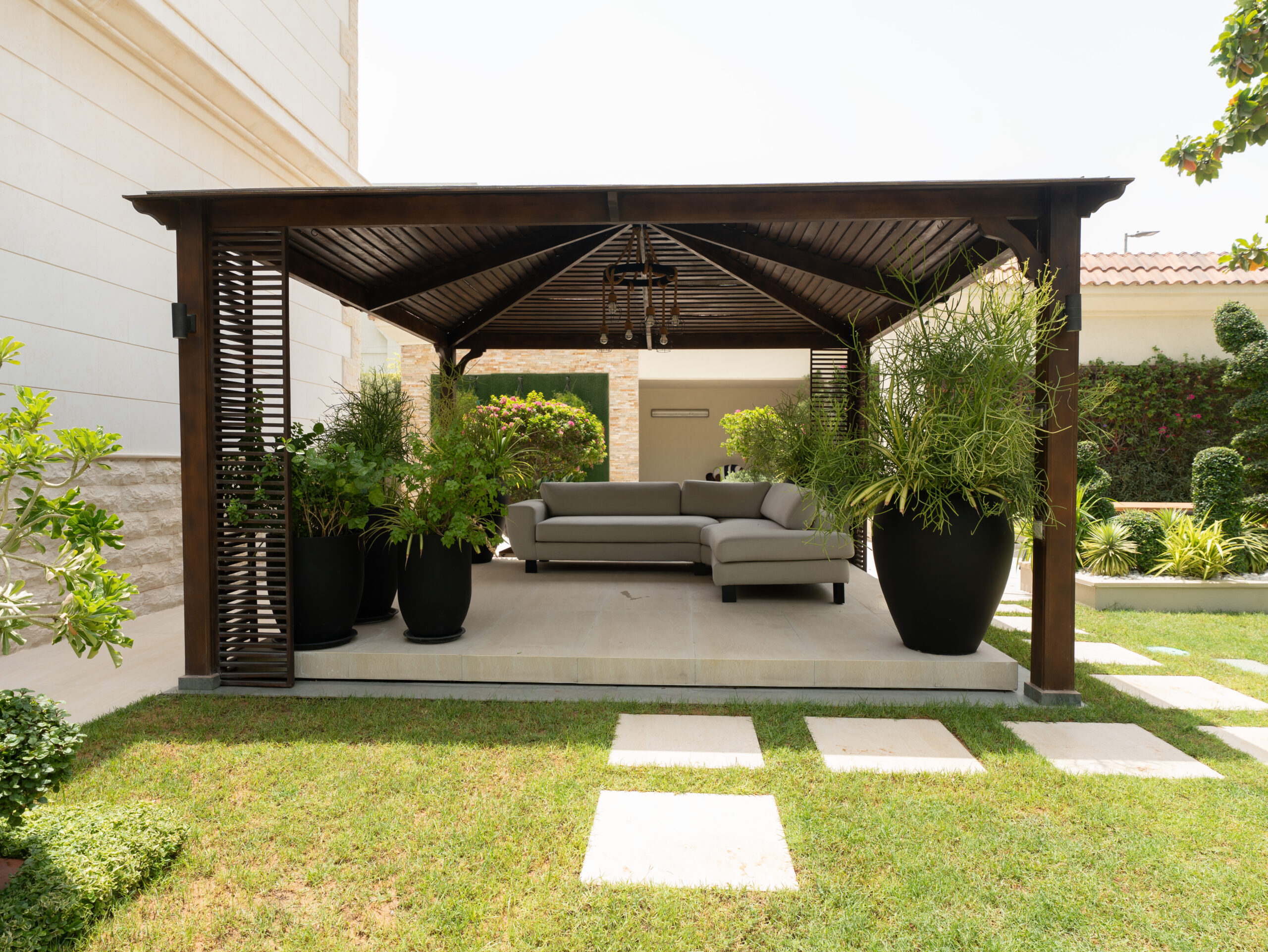 Our landscaping service includes softscape (plants, lawns, flowers), hardscape (pathways, pergolas, tiling), irrigation systems, outdoor lighting, and water features.