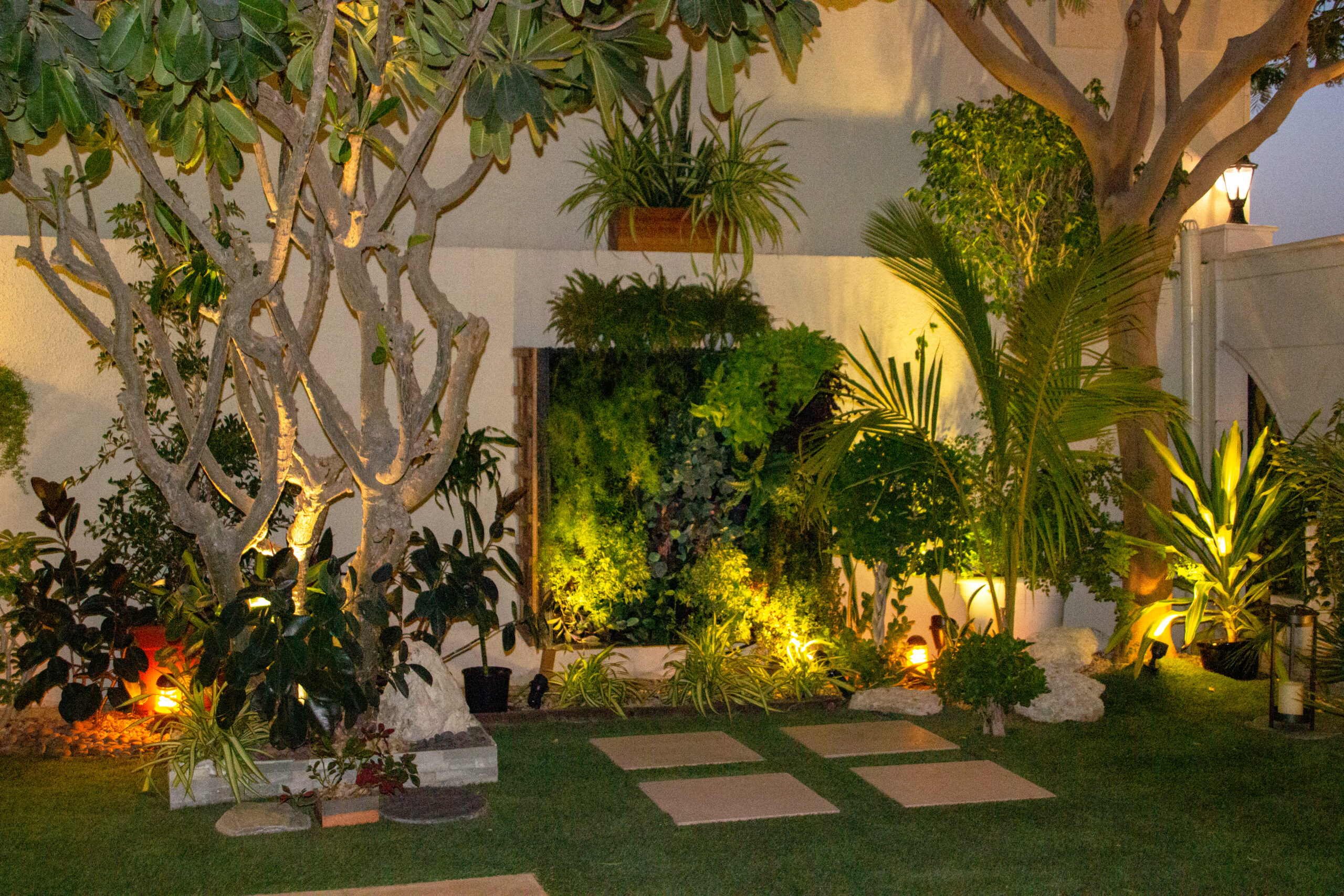 - Spotlights to highlight trees, plants, and water features.